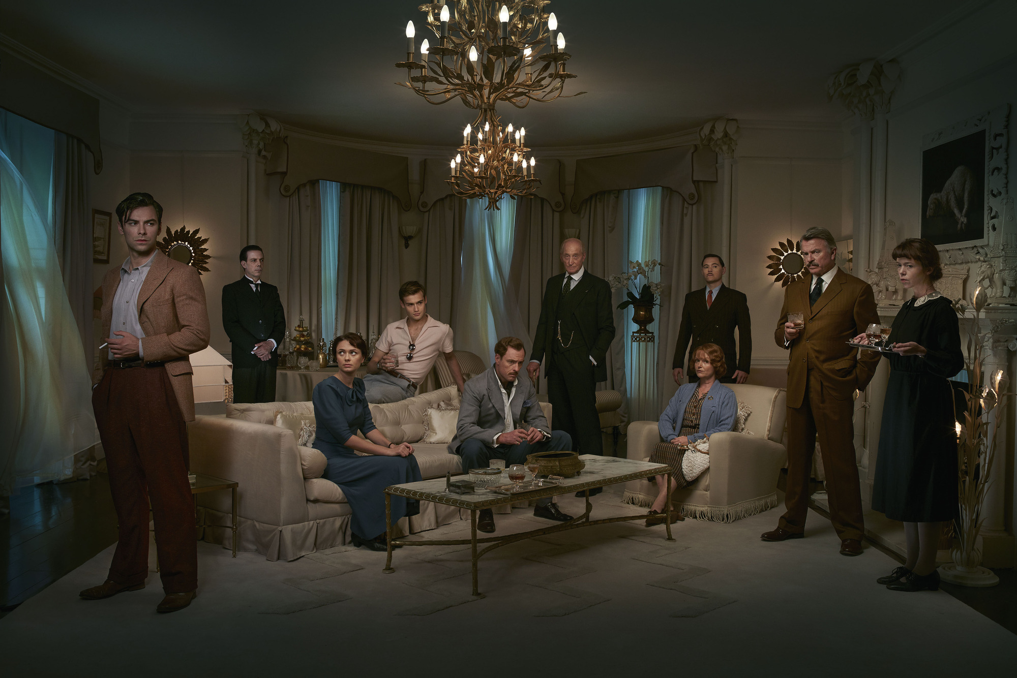 WARNING: Embargoed for publication until 00:00:01 on 24/11/2015 – Programme Name: And Then There Were None – TX: n/a – Episode: n/a (No. n/a) – Picture Shows: ++Publication of this image is strictlly embargoed until 00.01 hours Tuesday November 24th 2015+++ Philip Lombard (AIDEN TURNER), Thomas Rogers (NOAH TAYLOR), Vera Claythorne (MAEVE DERMODY), AJ Marston (DOUGLAS BOOTH), Dr Armstrong (TOBY STEPHENS), Judge Wargrave (CHARLES DANCE), William Blore (BURN GORMAN), Emily Brent (MIRANDA RICHARDSON), General Macarthur (SAM NEILL), Ethel Rogers (ANNA MAXWELL MARTIN) – (C) Mammoth Screen – Photographer: Todd Antony